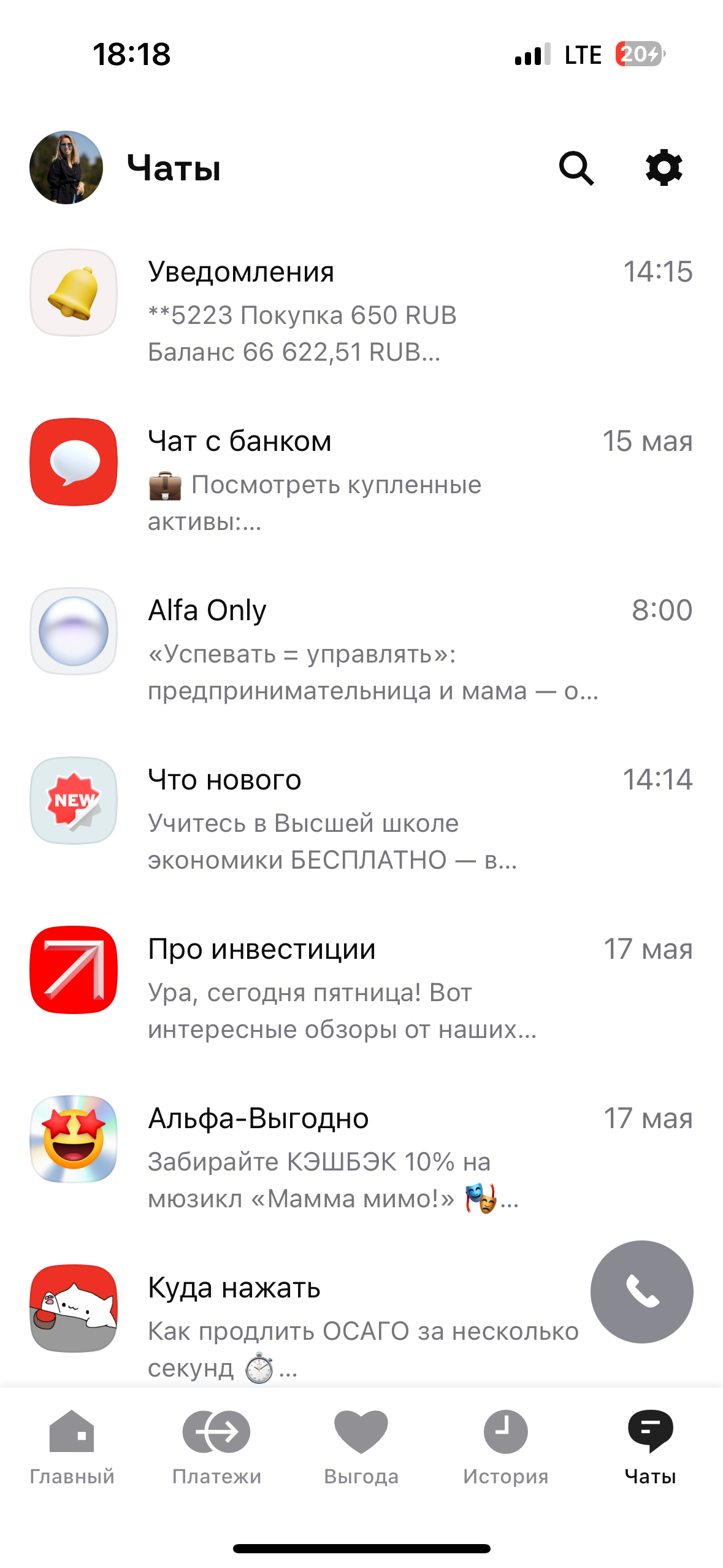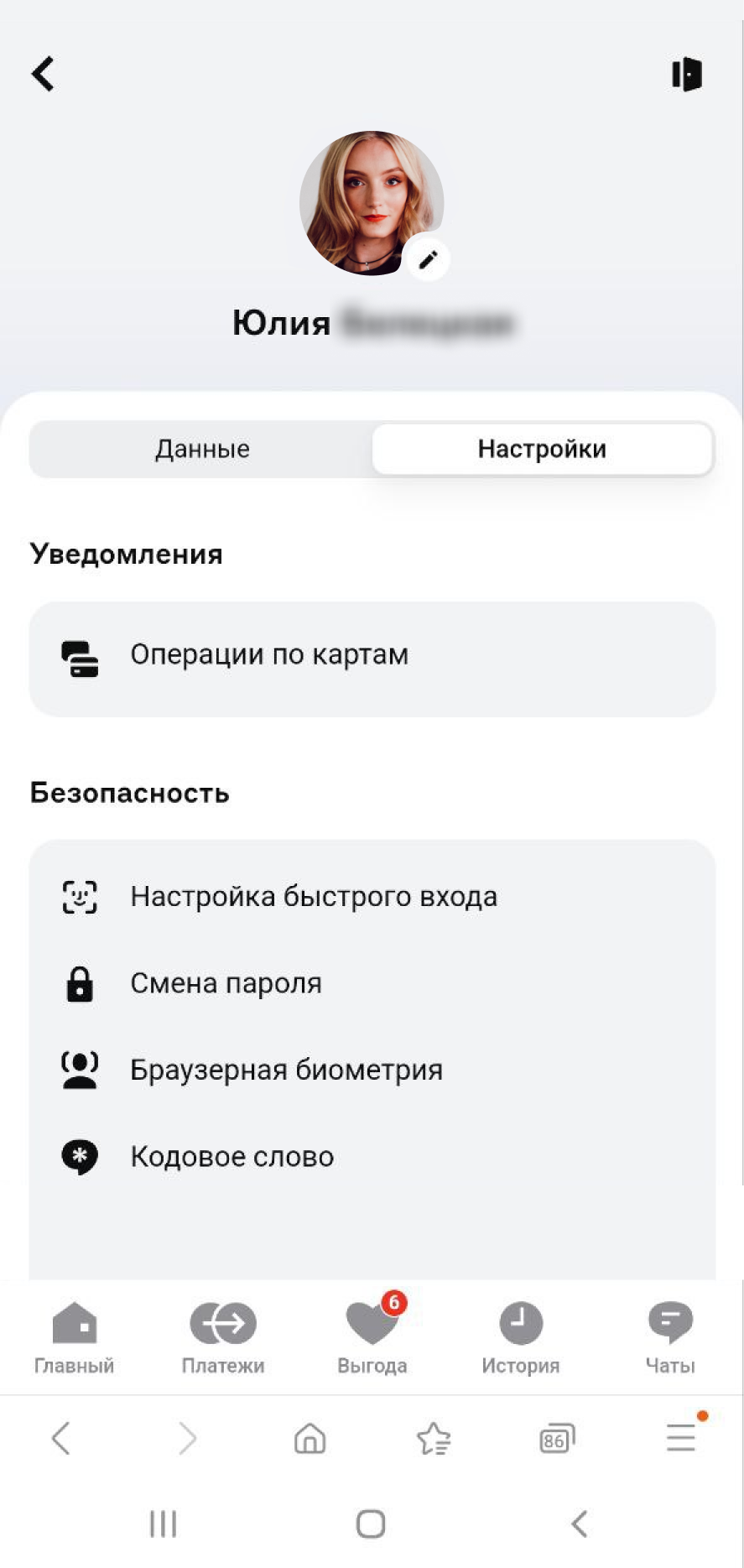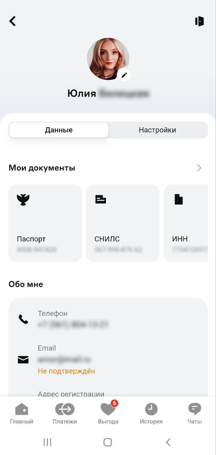 В разделе Мой профиль >> Данные загружайте аватар, редактируйте телефон, email или адрес регистрации. В Настройках меняйте пароль, кодовое слово и подключайте быстрый вход. В горизонтальной карусели Мои документы всегда под рукой данные паспорта, СНИЛС, ИНН.