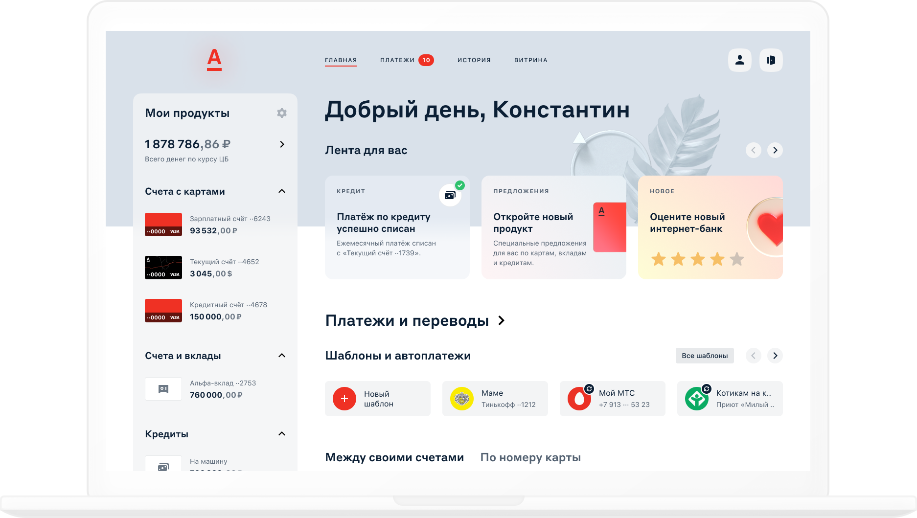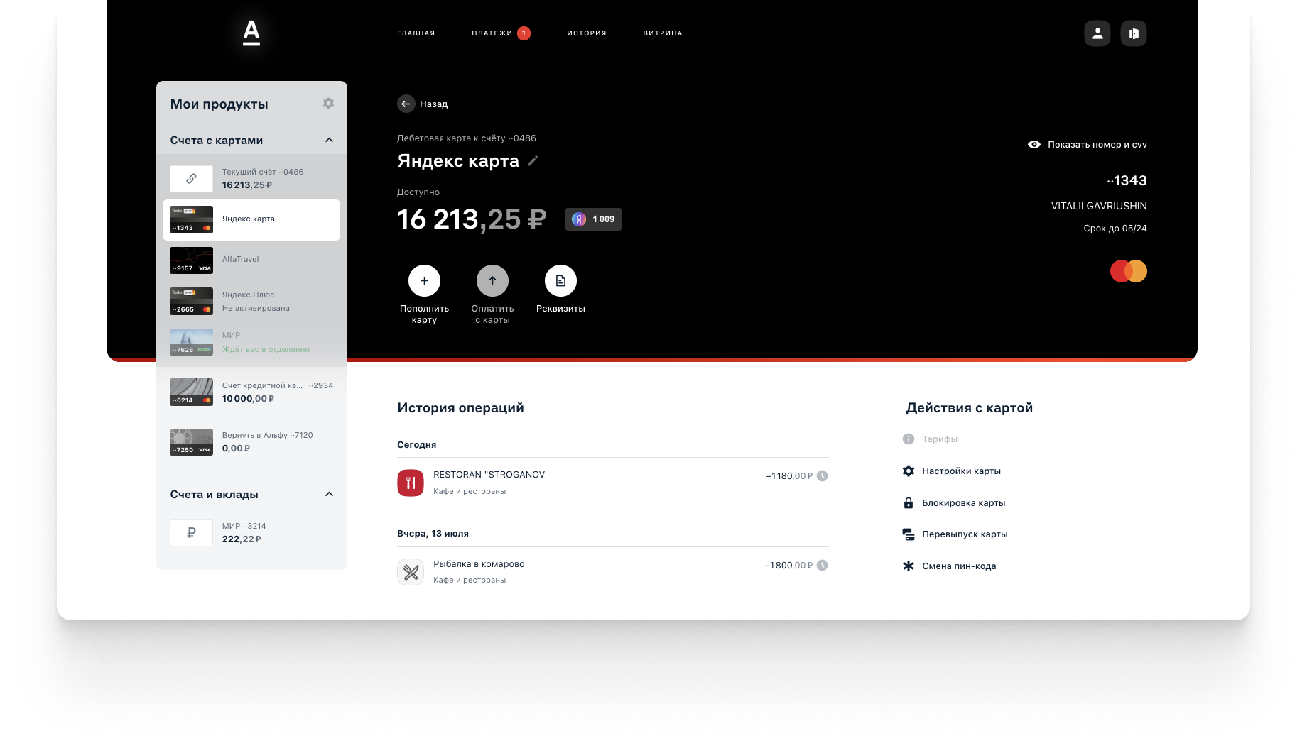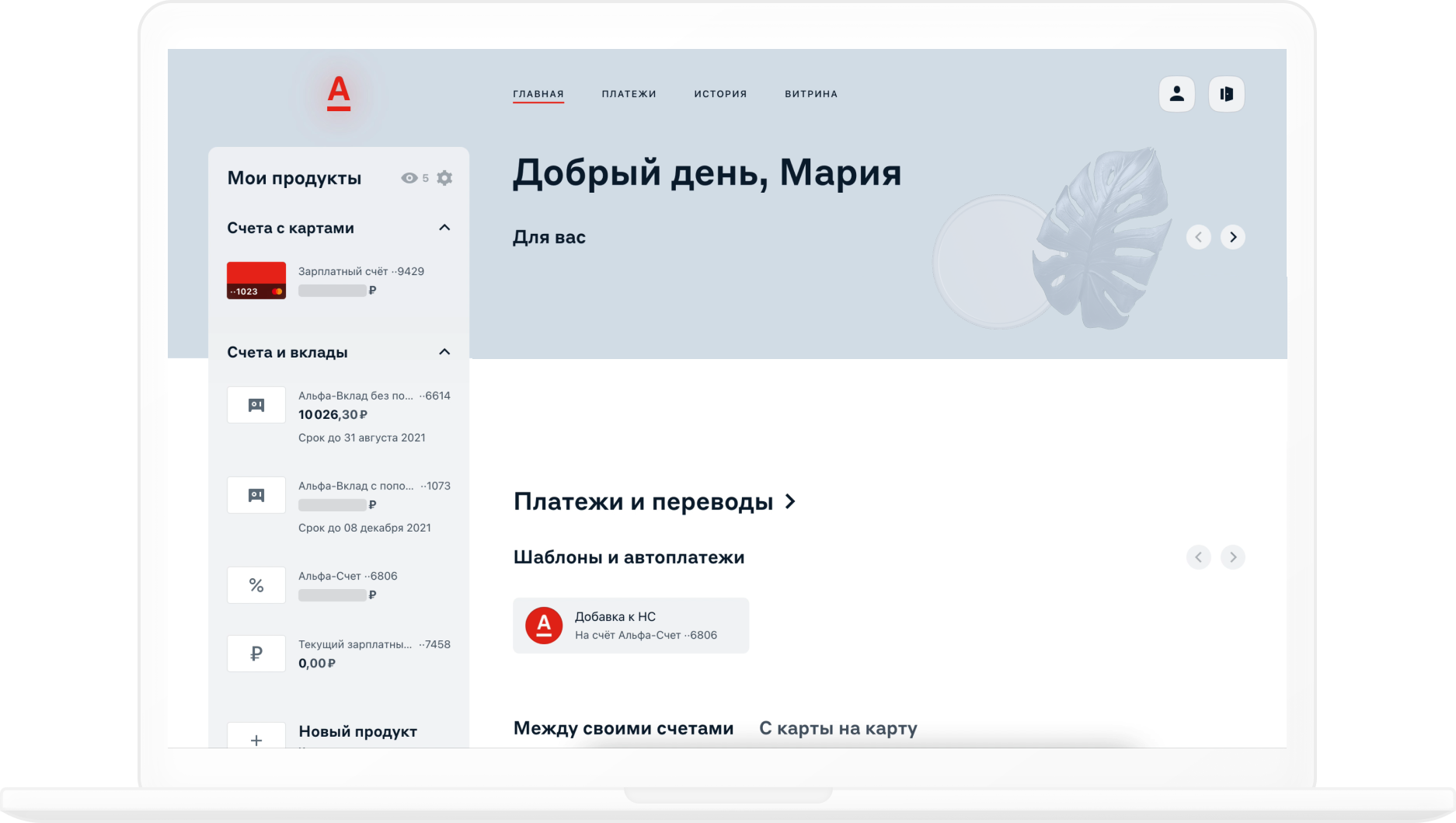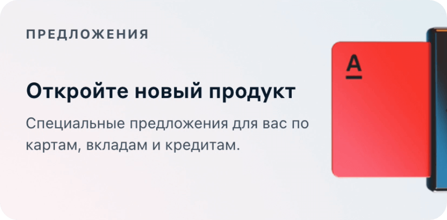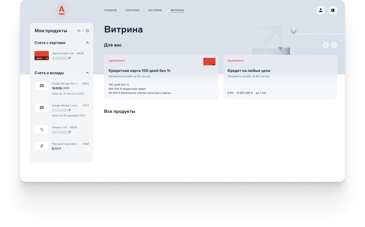 В разделе Витрина можно открыть счёт или вклад, заказать карту или оформить кредит. Там же — персональные предложения от банка.
