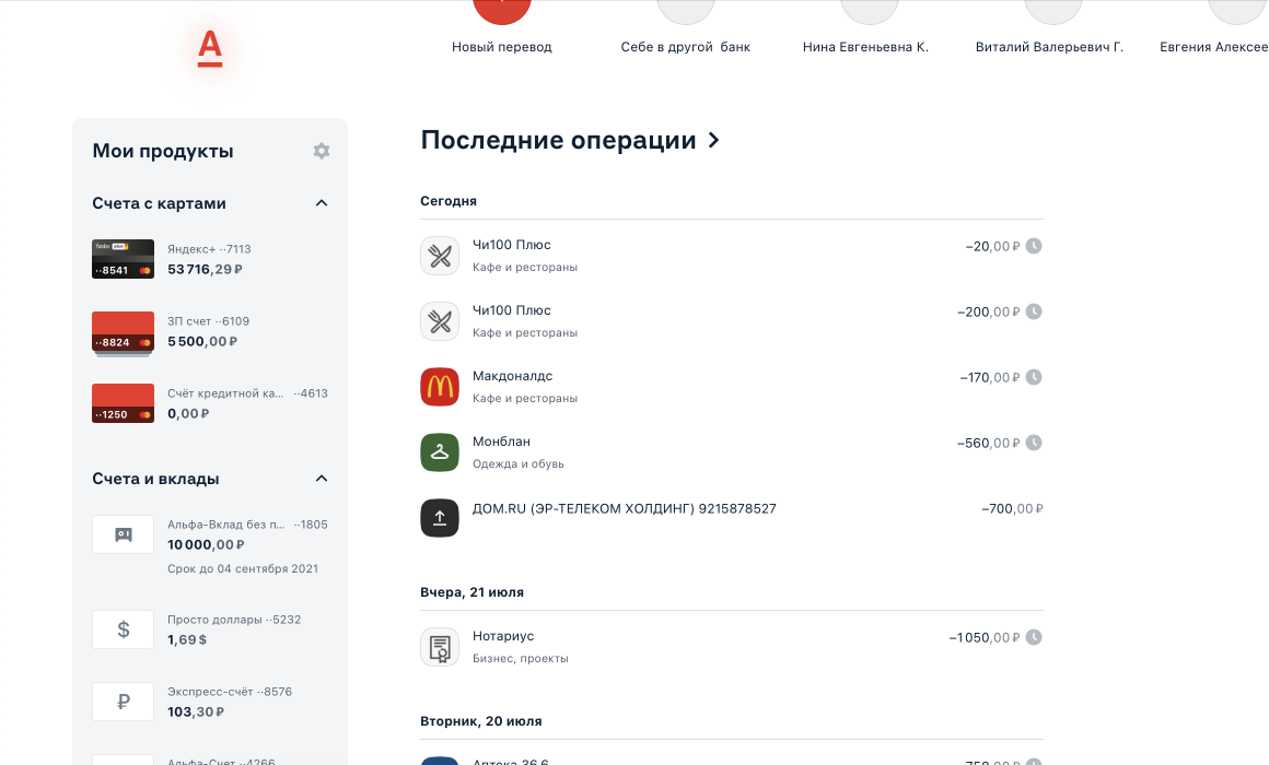 На главной теперь есть виджет для быстрого перевода. Можно перевести деньги между счетами или на карту другого банка, а можно купить или продать валюту по выгодному курсу (обновляется несколько раз в минуту).